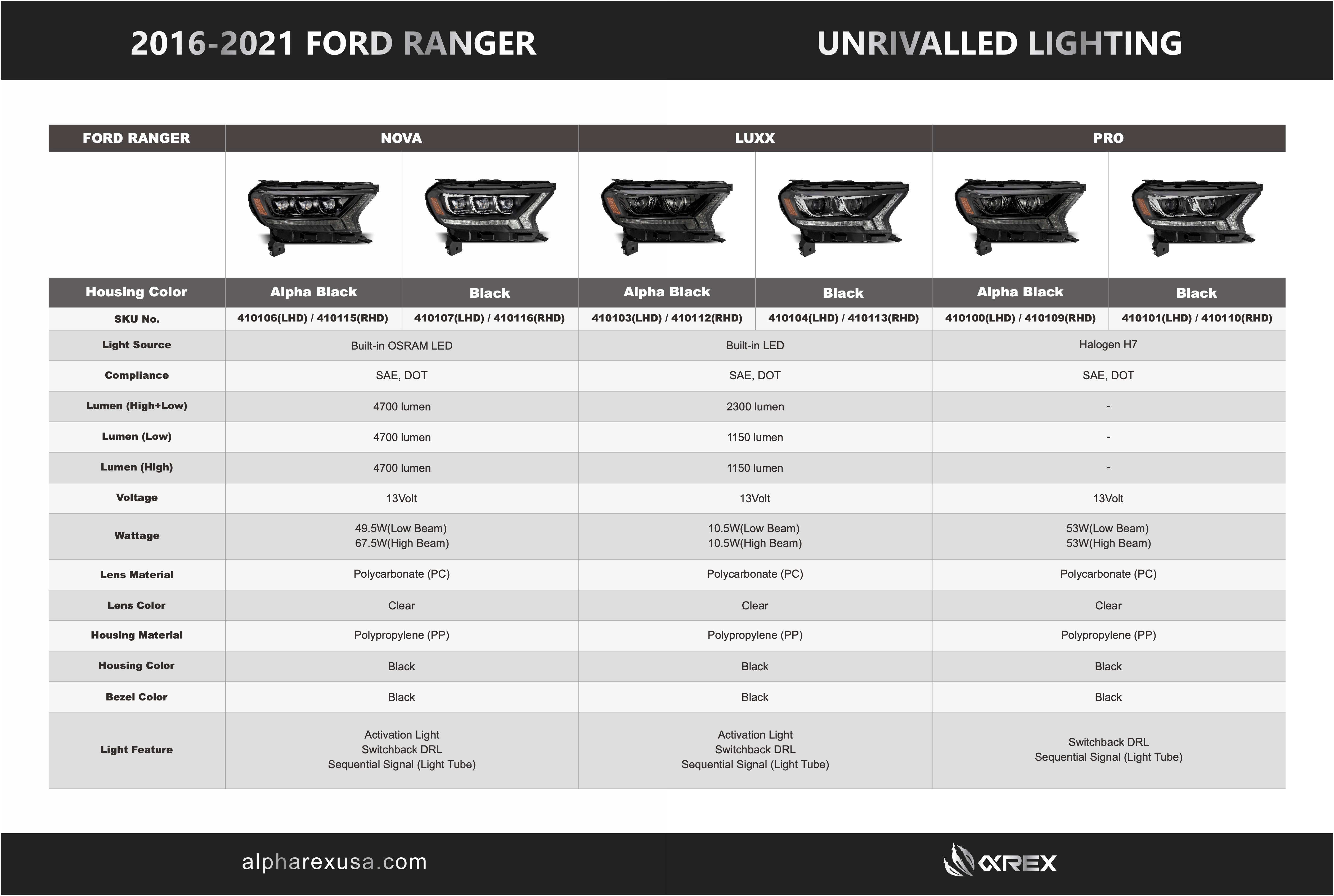 Our Ford Ranger PRO-series projector headlights come with black and Alpha-Black housing. The black housing gives your truck a sporty look and easily matches any color truck and front grill. On the other hand, the Alpha-Black housing is our specially designed housing that has the glossy look mixed with the black paint with smoke DRL lens, and it will give your truck an all-black sporty and luxury look at the same time. Read this article to learn more detail about our headlights color housing.